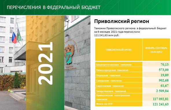 Всего за 9 месяцев текущего года Приволжское таможенное управление пополнило бюджет страны на 121 миллиард рублей (121 241,63 млн руб.), что на 14% больше результатов того же периода 2020 года.