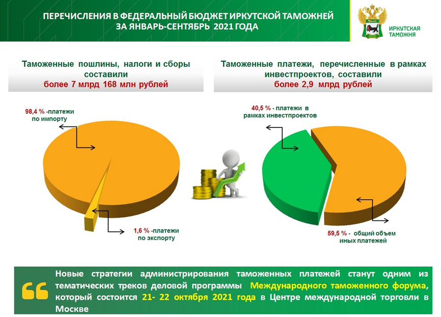 За 9 месяцев 2021 года таможенными органами в федеральный бюджет перечислено 4 808 млрд рублей. Достигнутый фискальный результат на 33% превысил прогнозное задание.