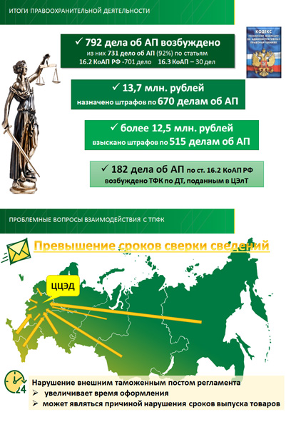 Юридические лица привлекались к административной ответственности 1090 раз, в отношении должностных лиц возбуждено 305 дел. Самое распространенное правонарушение – недекларирование товаров по установленной форме, ответственность за которое предусмотрена ч.1 ст.16.2 КоАП России, и сообщение перевозчиком в таможенный орган недостоверных сведений о товарах при прибытии на таможенную территорию, ответственность за которое предусмотрена ч.3 ст.16.1 КоАП России.