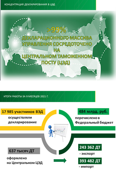 «Центральный ЦЭД ЦЭлТ является основным местом таможенного декларирования товаров в электронной форме, где сосредоточено 99,5 % декларационного массива от общего количества ДТ по Управлению» – подчеркнул в своем докладе начальник Центральной электронной таможни Сергей Беляев. – «За 9 месяцев 2021 г. на ЦЦЭД оформлено 636 844 деклараций на товары (ДТ), из них по экспорту - 243 362 ДТ, по импорту – 393 482 ДТ. В автоматическом режиме зарегистрировано 529 009 ДТ или 82,4% от их общего количества».