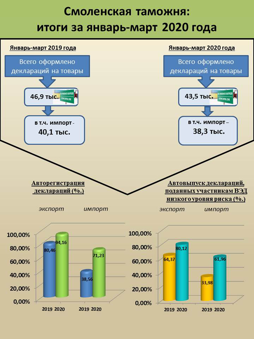За 3 месяца 2020 года в таможню подано 20,5 тысяч деклараций на товары, что на 24% больше показателя 2019 года, – рассказал начальник Владимирской таможни Павел Павлов. – Доля экспортных деклараций возросла на 19%, а доля деклараций на ввозимые товары - на 28%. За указанный период декларировались 48 тысяч наименований товаров, что на 45% больше, чем в 2019 году.