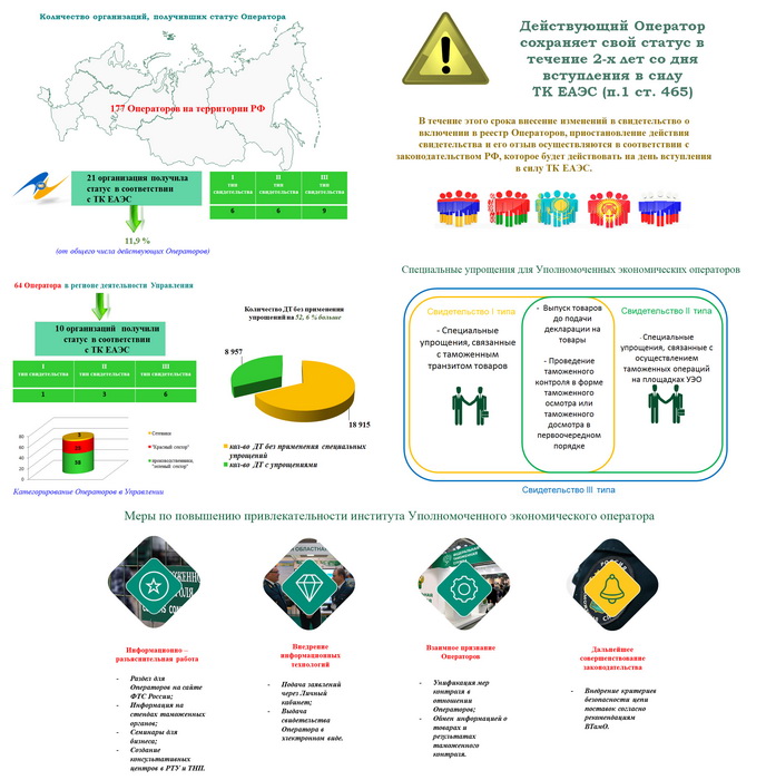 - По состоянию на апрель 2019 года в реестре ФТС РФ было 170 действующих участников ВЭД, получивших этот статус, 70 исключены или действие приостановлено. В регионе деятельности Управления осуществляют деятельность 64 УЭО, что составляет 36 % от всех Операторов по ФТС России, - уточнил Виталий Анатольевич. - Из них 10 получили свидетельства о включении в реестр в соответствии с ТК ЕАЭС. Таким образом, более 47 % Операторов, получившие статус в соответствии с ТК ЕАЭС осуществляют свою деятельность в регионе деятельности Управления. Анализируя вышеназванные цифры, очевидно, что процент УЭО получивших свидетельство нового типа за период с января 2018 года по настоящее время – довольно низкий. И это с учетом того что срок окончания переходных положений, в течение которого Операторы могут функционировать в соответствии с ранее установленным порядком заканчивается через полгода.