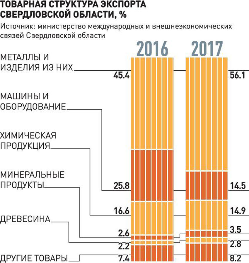 В структуре экспорта УрФО машиностроительная продукция занимает лишь 10 процентов и не может тягаться по объемам с поставками углеводородов из северных автономных округов. Однако для Свердловской, Челябинской и Курганской областей машиностроение традиционно остается одной из системообразующих отраслей. Пережив в 90-е - начале нулевых годов тяжелые времена, оно постепенно возрождается и отвоевывает позиции, в том числе и на внешнем рынке.