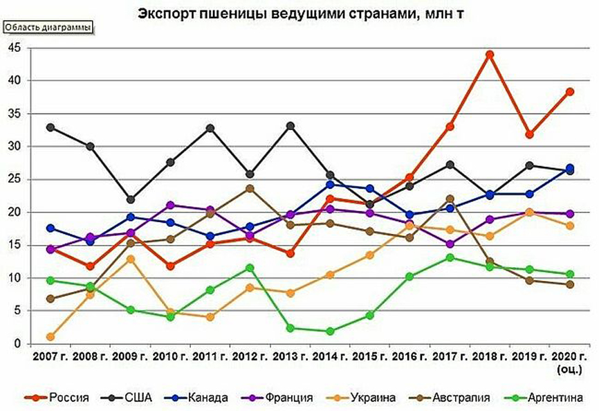 Согласно текущим данным Федеральной таможенной службы (ФТС), за 11 месяцев 2020 года экспорт пшеницы из России составил 33,7 млн тонн. Результаты остальных стран гораздо скромнее: